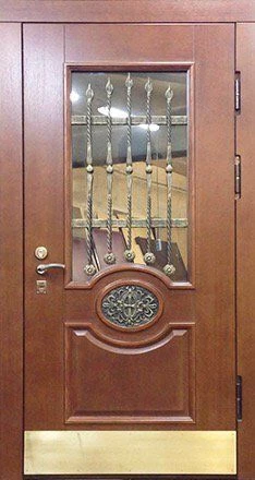 Поговорим об отделке. Вариантов декора дверей много. В большинстве случаев, для отделки элитных дверей используется массив натурального дерева или натуральный шпон с фрезеровкой. Цвет двери так же делается по желанию заказчика. Очень красиво и представительно выглядят двери с ковкой и стеклом.